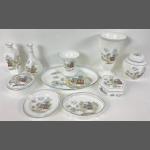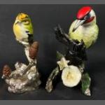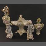 A collection of highly decorated china ornaments to include a lidded jug with stopper 25cm tall (slight damage to a very few petals), a Von Schierholz porcelain faux urn with 2 cherubs (16cm high) ( 1 cherub missing an arm, and damage to 3 leaves), a bonbon dish with a cherub (18cm high) whose arm has been re-attached and damage repaired to the handle, a lady (hand missing) and gentleman in 18th century dress (16cm tall),