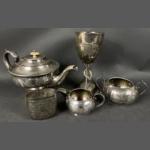 An EP teapot, milk and sugar plus a possible small plated base to a hip flask and a plate presentation cup from the Scottish National Regatta Regimental Cup 4-oared gig race won by Robert S McLellan 14th August 1875 (20cm high)