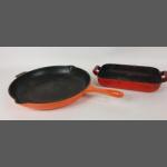A large LE CREUSET volcanic orange frying pan (30cm dia) and a WATERFORD COLORCAST shallow lasagne dish (24Lx16.5Wx5Hcm)