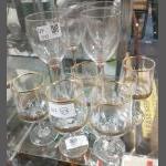 FOUR EXQUISITE wine glasses with peach tinted stems and bases 20cm tall with also five beautiful gilt edged sherry glasses 13cm tall
