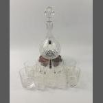 1st CLASS QUALITY! A ROYAL SCOT HAND CUT LEAD CRYSTAL decanter with stopper and wooden base to fit into - 33cm tall incl the base x 13cm wide approx with 6 small liqueur glasses 6cm tall x 4cm diameter and lastly 6 small WHISKY TUMBLERS 8cm tall x 6cm diameter - all in great condition!