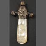 An antique silver hallmarked, Birmingham 1897, baby's rattle/teether/whistle with mother of pearl handle 8cm long