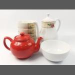 A cheery red PRICE & KENSINGTON teapot (14cm high) plus a FLIRT by R&B coffee pot with a floral edging and 4 bowls (14cm dia) also by Flirt and 1 plain white bowl