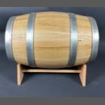 A wooden sherry barrel on a stand length 36cm, height (on stand) 32cm, needs a bung.