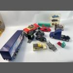 A box of pre-loved model cars mostly in good condition to include a mounted MIRA BUICK CENTURY (1955), an iconic MINI COOPER with Union Jack on its roof, a boxed Corgi MINI 7 (CC82216), 4 boxed SOLIDO cars - Bugatti Atalante, Minibus 4405, Talbot T23, Jaguar SS, plus various trailers, horse box (complete with horse) etc