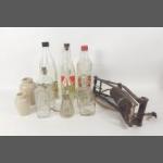 A mixed box of vintage glass bottles including one with a LUCOZADE label and 2 stoneware jars 'stamped 'VIROL' a preparation of BONE-MARROW an ideal fat food for children's & invalids 15cm and 11cm plus a foot pump