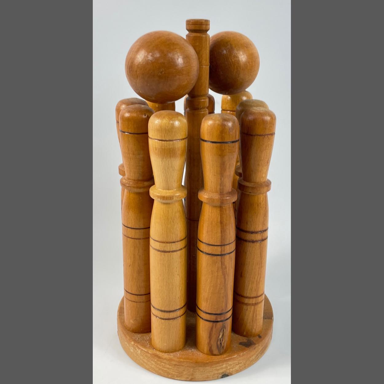 A vintage wooden skittle set complete with 2 balls all neatly stored for easy transporting on holiday stands 30cm tall