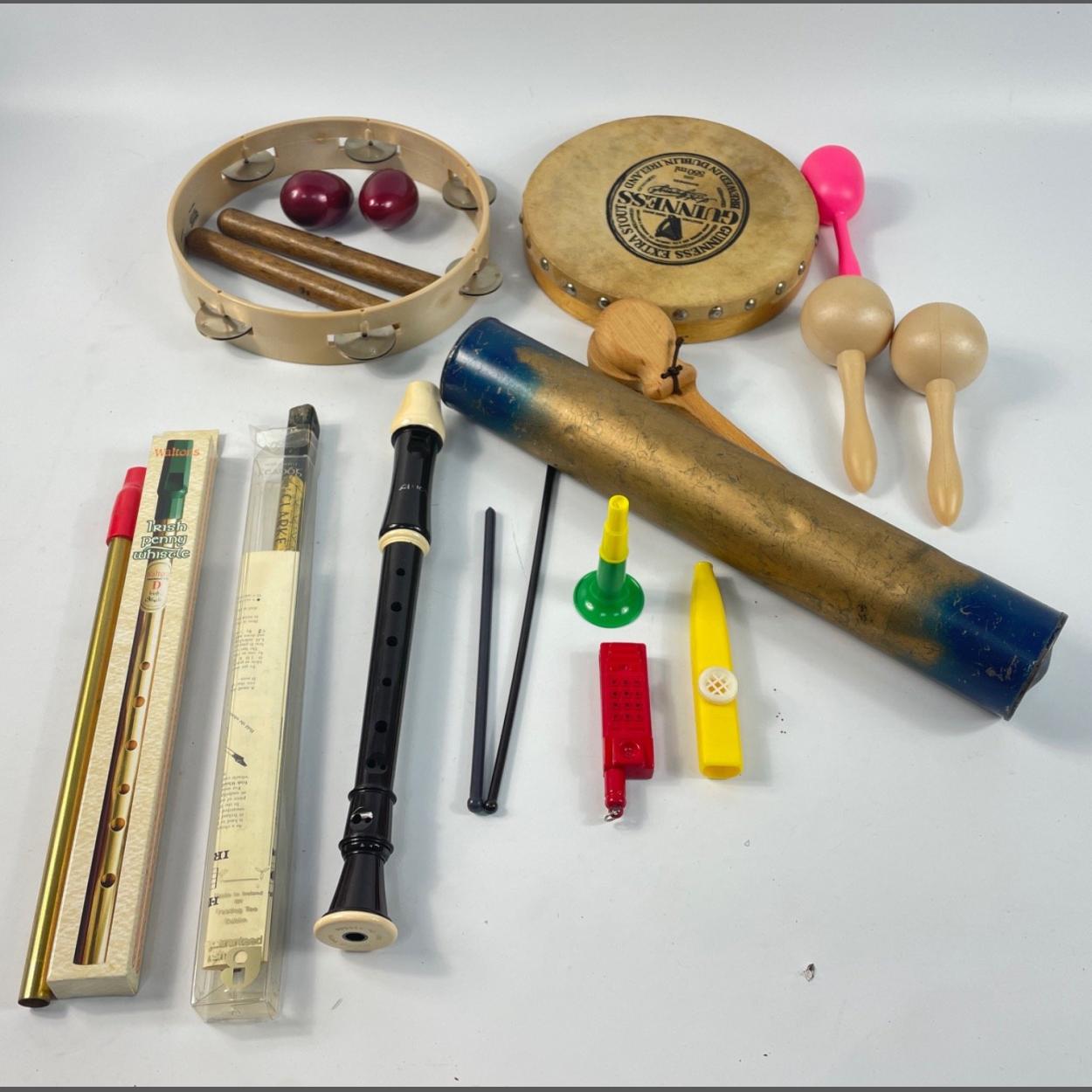 Instruments to make noise with - a great selection of wind and percussion instruments to include an Irish penny whistle, a tambourine, a small bodhran, maracas and castanets plus a foldaway music stand,