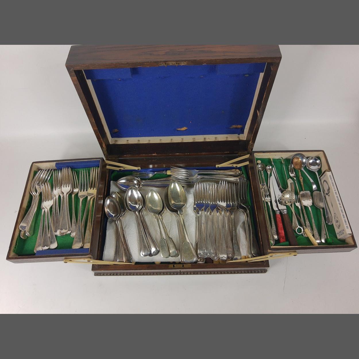 A large wooden canteen of cutlery (40Wx30Dx11cmH) 2 cantilever layers and a quantity of EPNS cutlery including fish knives and forks, pickle forks etc