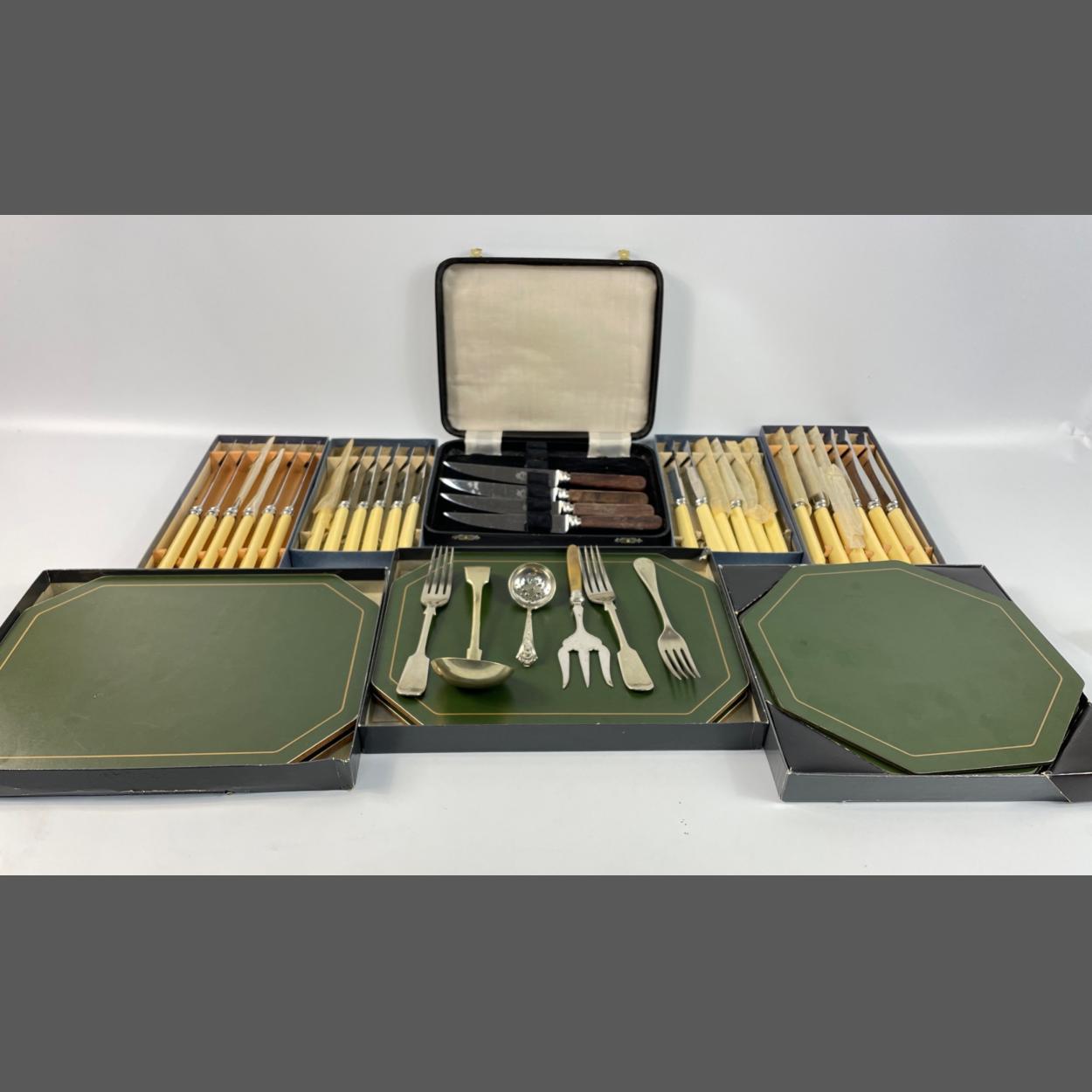 Four boxes of unused THOS E OSBORNE stainless steel knives, a box with 4 steak knives, 2 boxes of CLOVERLEAF serving mats and 1 box of 8-sided place mats all in moss green with gold trim plus some EPNS cutlery
