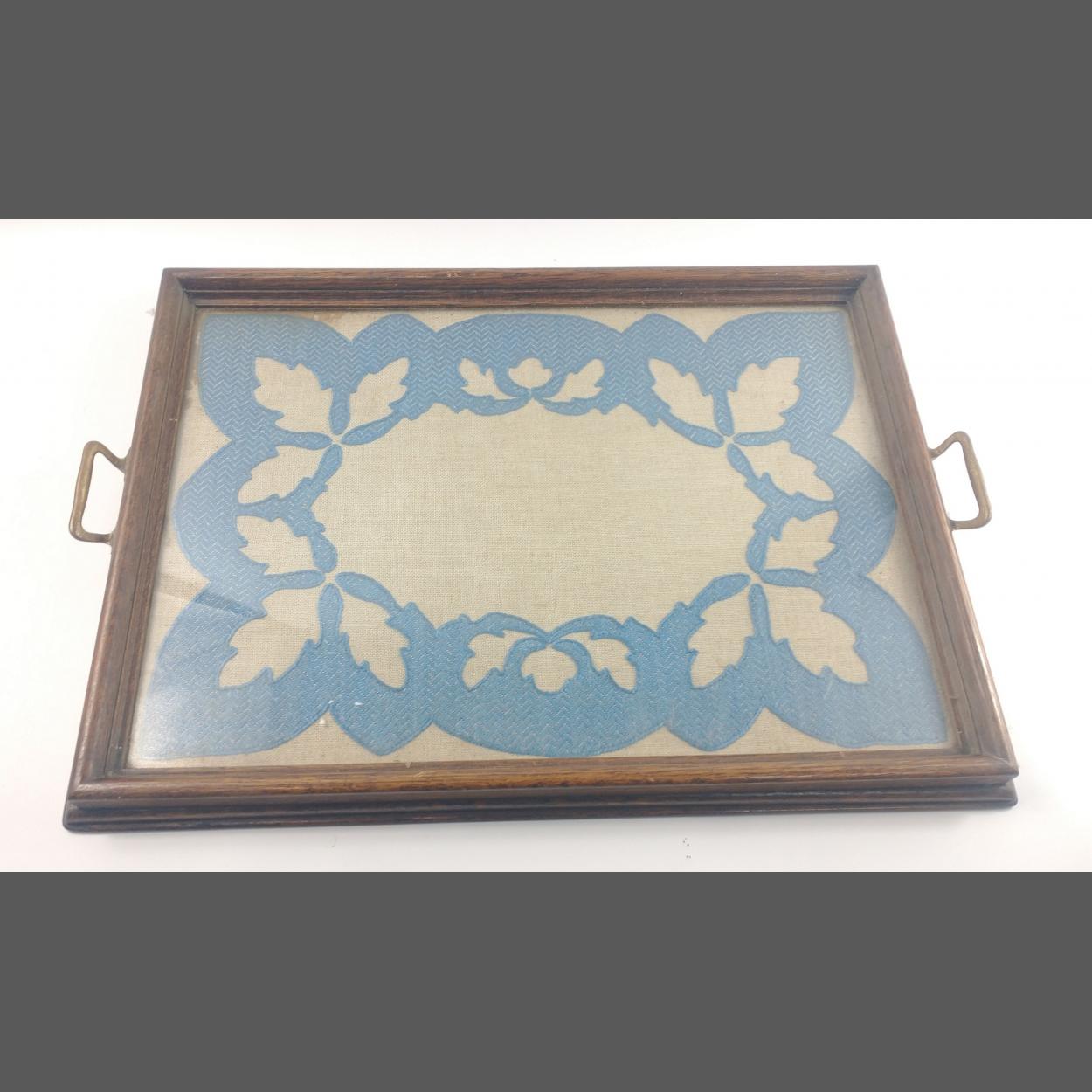 A SUBSTANTIAL oak and glazed butler's tray with cutwork embroidery with a pair of brass handles 57Wx44Dx4Hcm approx