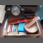 A box of antique and vintage children's books to include Twenty Scottish Tales and Legends by Allan Stewart, also a teak fruit bowl, a brass gong, a Rabone Chesterman 600mm spirit level and an old mantel clock