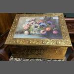 A VINTAGE FIRESIDE Brass repousse SLIPPER BOX with a CHARMING anemonies floral decoration on the front - Width 39cm x depth 29cm x height 26cm approx