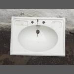 A BARN FIND - an early 20th century moulded ceramic bathroom sink 67Wx48Dx23H cm with original sink hole plug on a chain