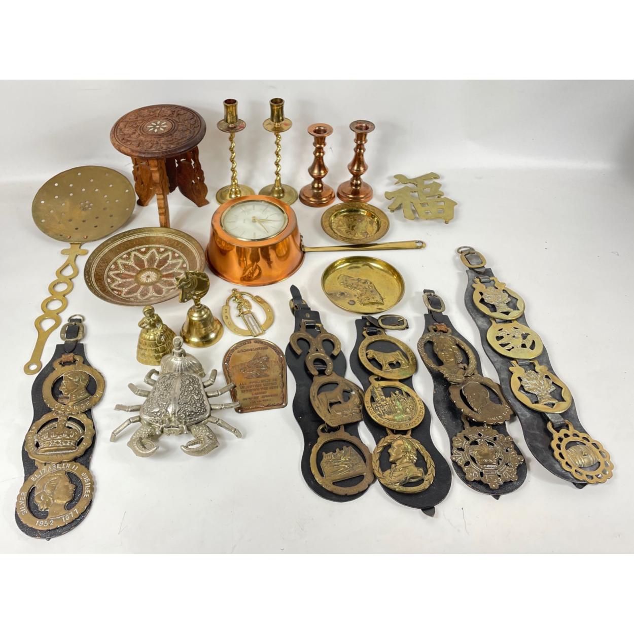A collection of brass items to include candle sticks, horse brasses, trivets etc