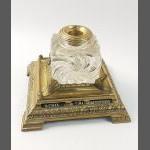 A large, vintage glass inkwell on a brass base with perpetual calendar 17x17x14cmH, some damage to lip of inkwell but covered by the brass sconce