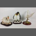 A Border Fine Arts SNOWY OWL (A4056) by Russell Willis standing 28cm tall, and a large LEONARDO Collection group of a pair of emperor penguins standing 26cm tall), and a large LEONARDO swan standing 20cm tall