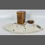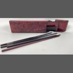 A wooden carved box with a chinese dragon and 12 chop sticks