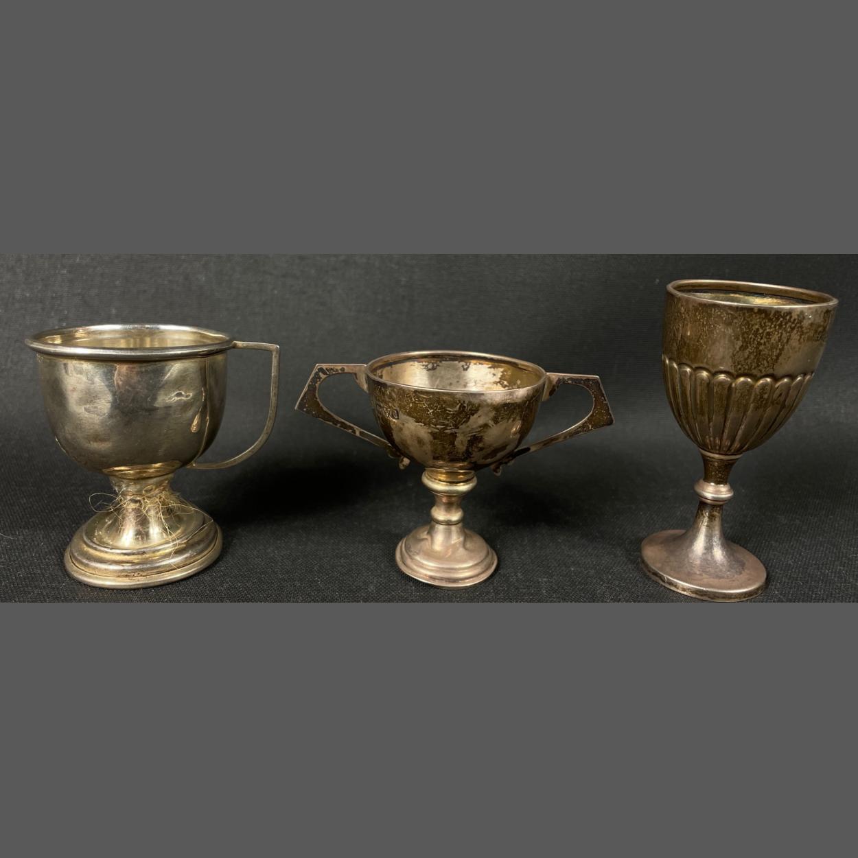 Three small silver hallmarked cups (tallest being 8cm), the first - Chester 1926, weight 29g, the second possible Chester 1875, weight 18gm, and the third (AF) unclear assay marks weight 20g