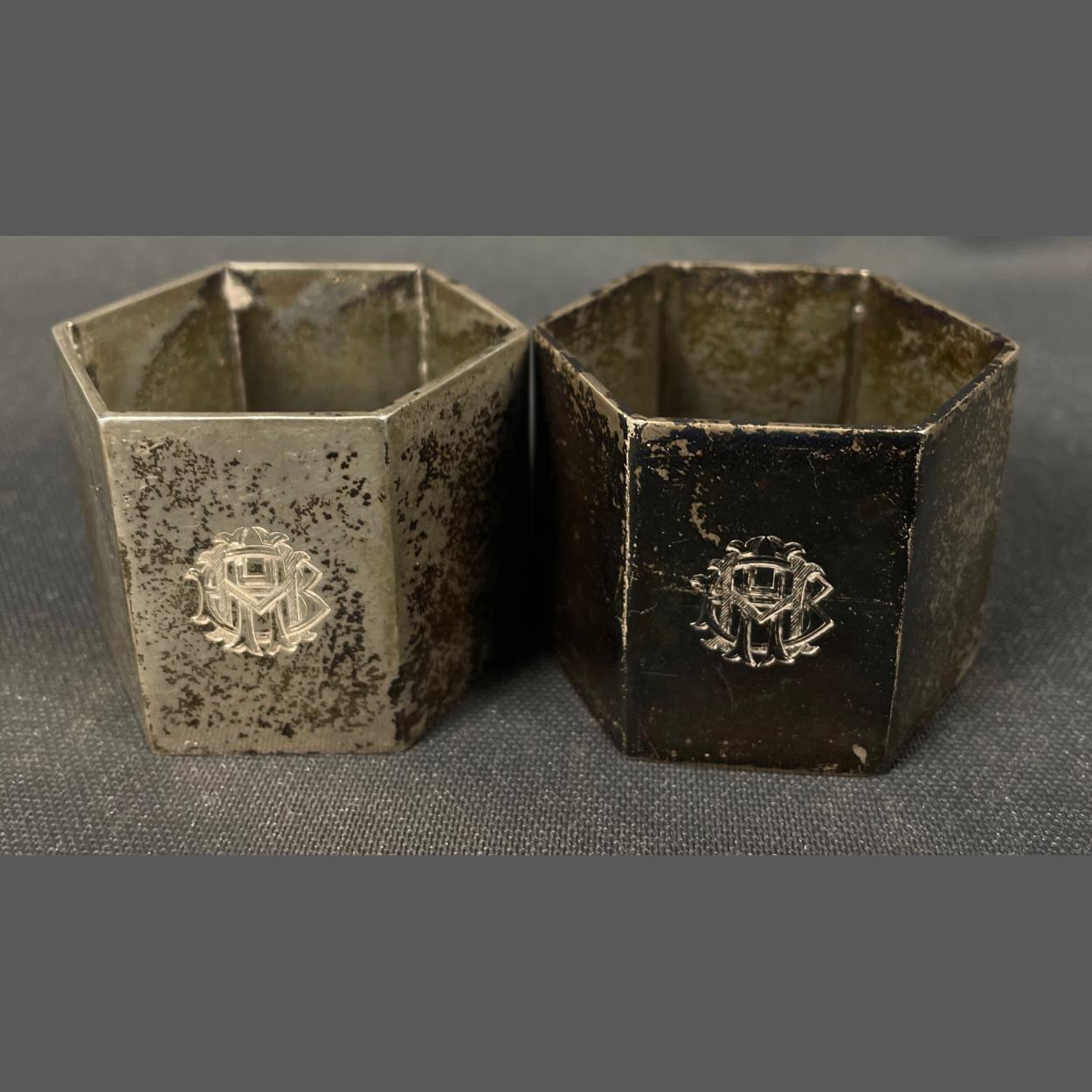 A pair of monogrammed silver hallmarked napkin rings, Sheffield 1920 and 1926 made by silvermakers Thomas Bradbury & Sons, weight 143g