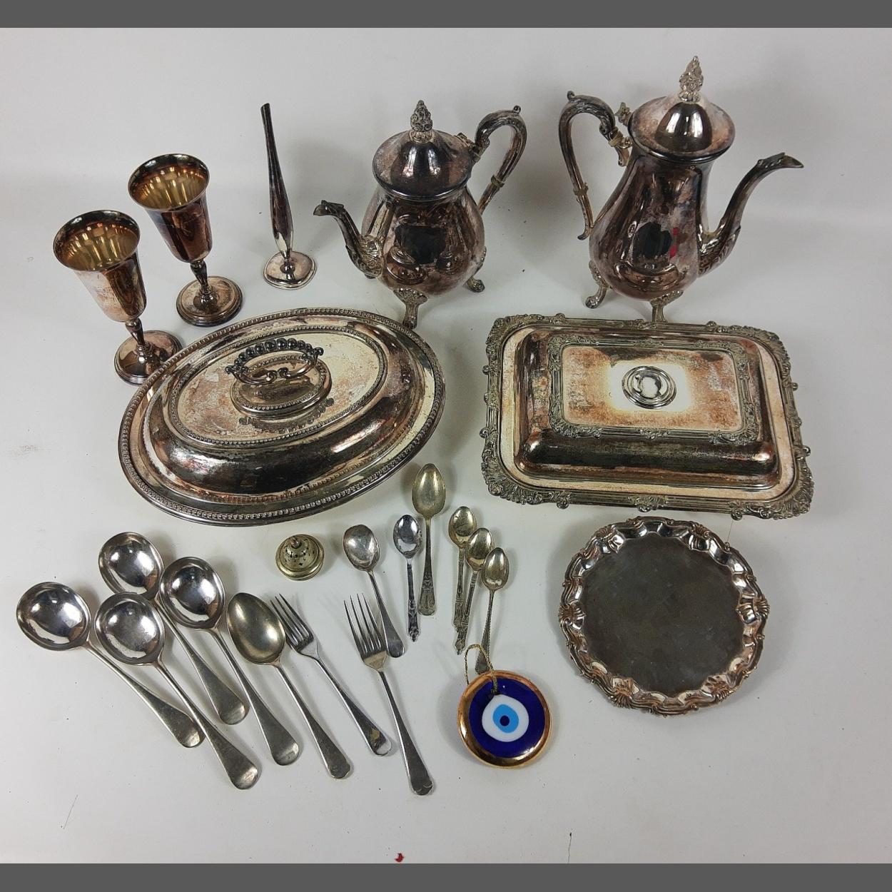 A MAPPIN BROTHERS white metal serving dish (30cm long), a VINER'S silver plate teapot (25cm high) and matching coffee pot (29cm high, lid hinge needs repair), a lidded serving dish (30cm long), 2 goblets and a small salver missing one leg (17cm dia)