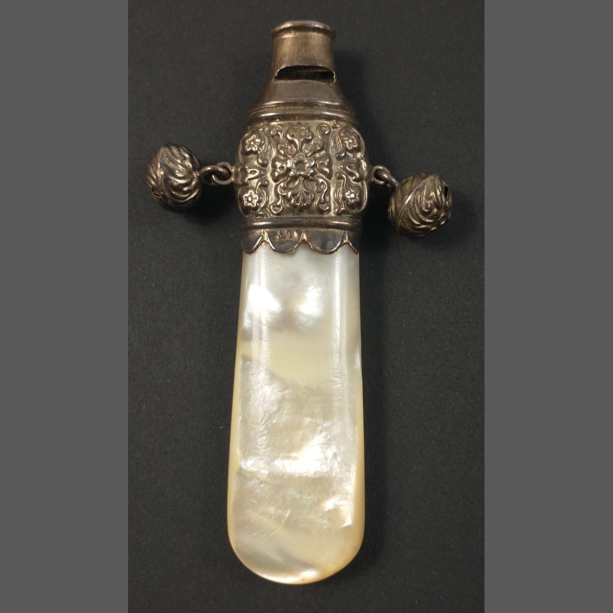 An antique silver hallmarked, Birmingham 1897, baby's rattle/teether/whistle with mother of pearl handle 8cm long