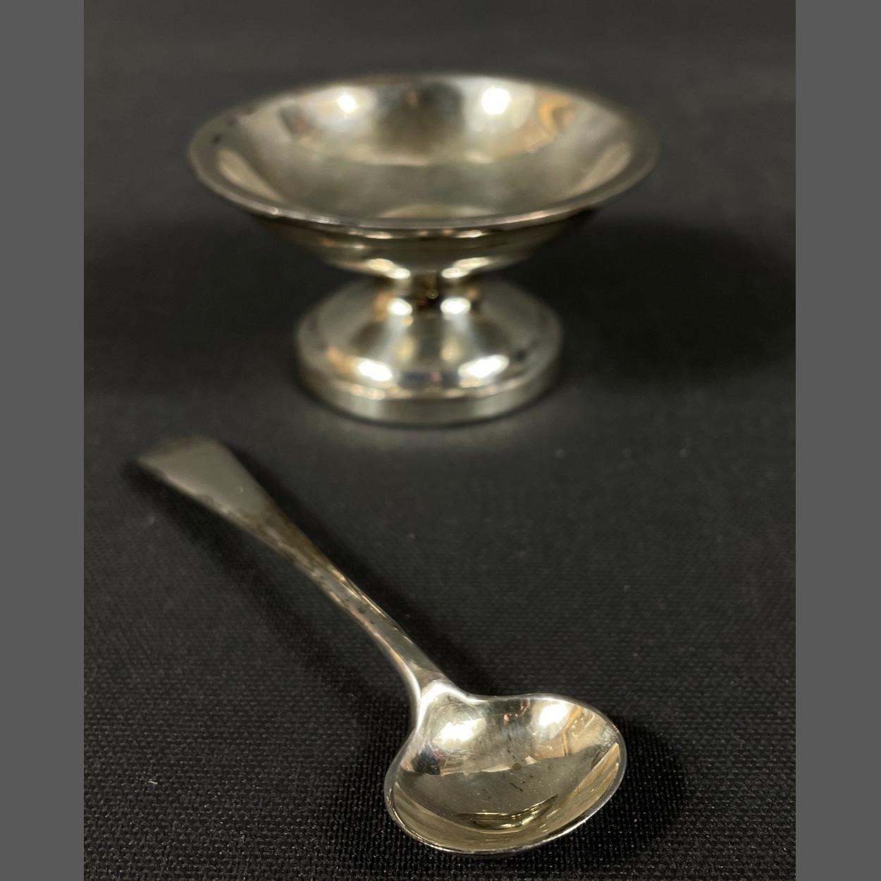 A small silver plate dish on a pedestal (7cm dia and 4cm high) and spoon by GUSTAV ERIKSSON of Sweden