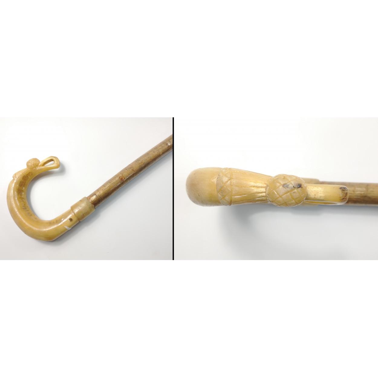 A wooden walking stick with horn handle with a carved thistle decoration, 118cm long approx
