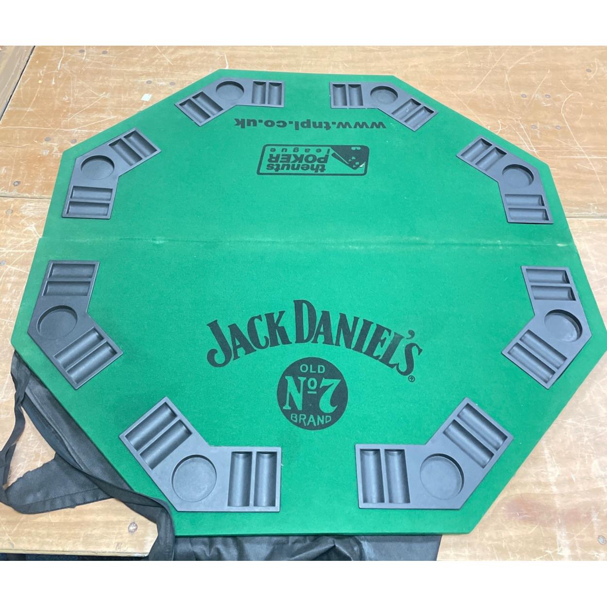 A portable THE NUTS Poker league fold-away table top board featuring a JACK DANIELS logo with another dimension 4ft diameter when folded-out - with carry bag