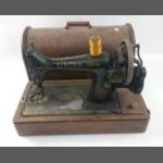 A hand-operated SINGER SEWING MACHINE in a wooden case with the registration number F8332901 dating it to 1918
