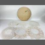 A most unusual hand-made and embroidered case for doilies (35cm diameter) plus the contents of Belgian lace doilies and also a box of vintage heavily embroidered satin taken from a mid-century dress plus a plaid stole,