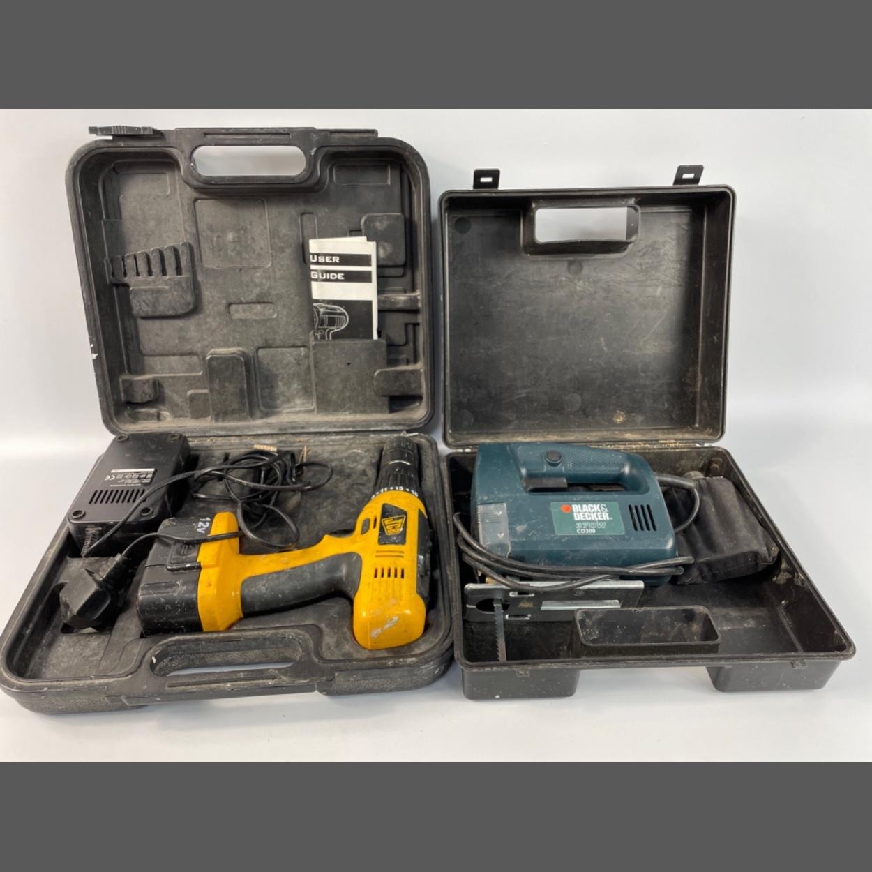 A boxed BLACK & DECKER saw drill 370W CD300, and a boxed JCB cordless drill (JCBD-CD12), with user guide and charger