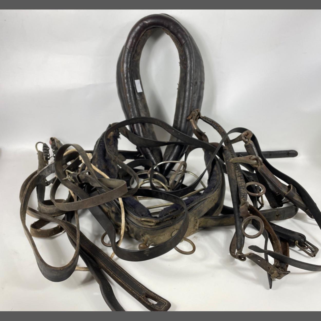 A box full of donkey tack to include 2 working donkeys collars (donkeys used as lawnmowers) , stirrups etc