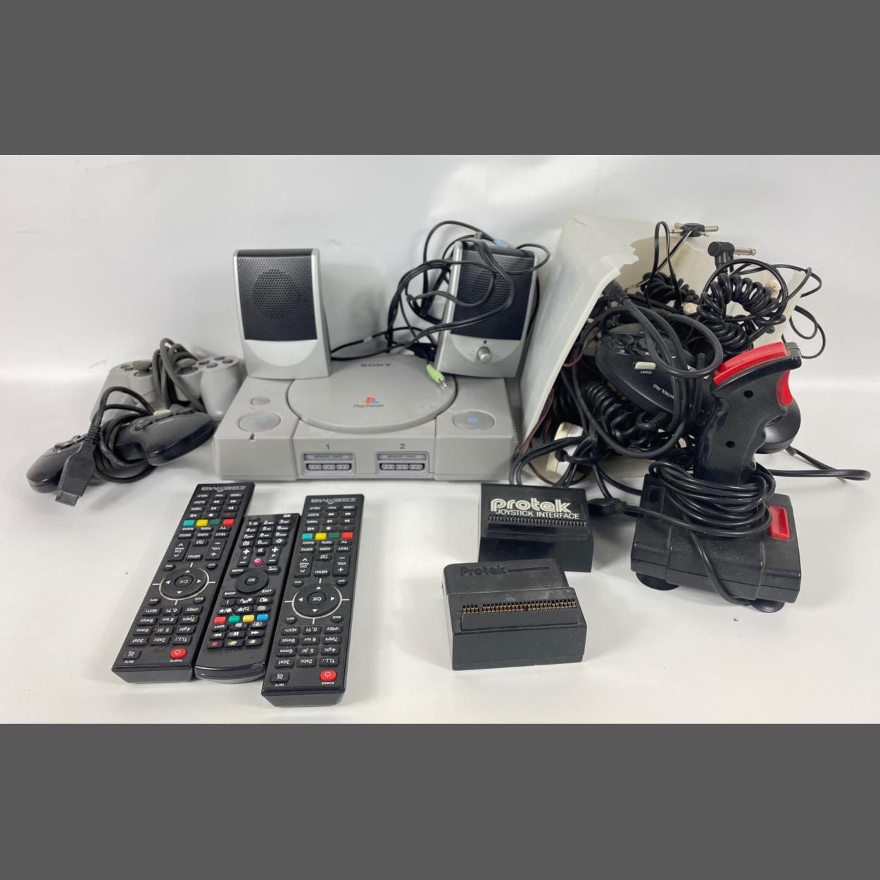 A PLAYSTATION 1 with one controller and various bits of SEGA MEGA DRIVE controller and various wires etc, to also include a small set of what looks like a pair of TV surround sound speakers etc