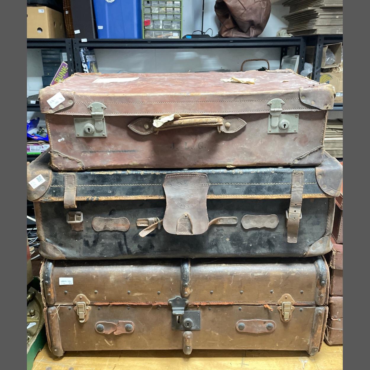 Three vintage items of luggage to include a large steamer trunk with bentwood bindings 83Wx52Dx34Hcm - also a large black heavy duty suitcase with brown leather corner protectors and bindings with the initials LG 84Wx46Dx28Hcm - and lastly an all-leather brown suitcase with leather corner protectors 70Wx37Dx20Hcm