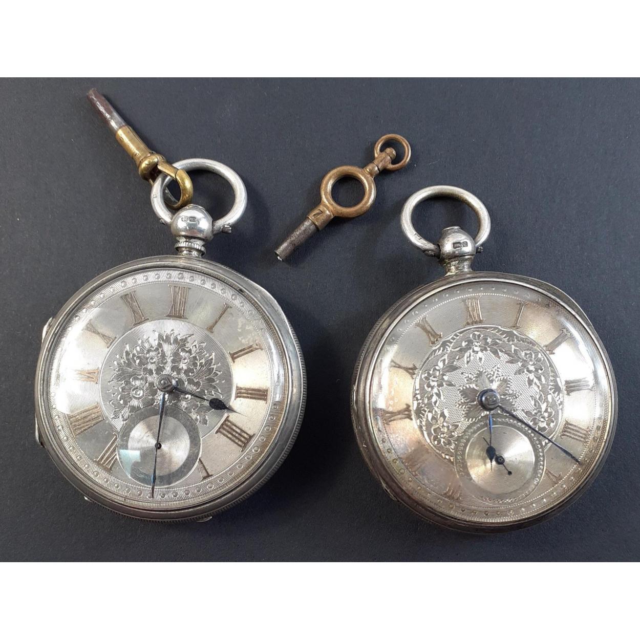 A pair of matched silver cased pocket watches. Both London Hallmarks, one dated 1881 the other 1889. Neither running at valuation. Total gross weight 235g approx. Beautifully finished dials.