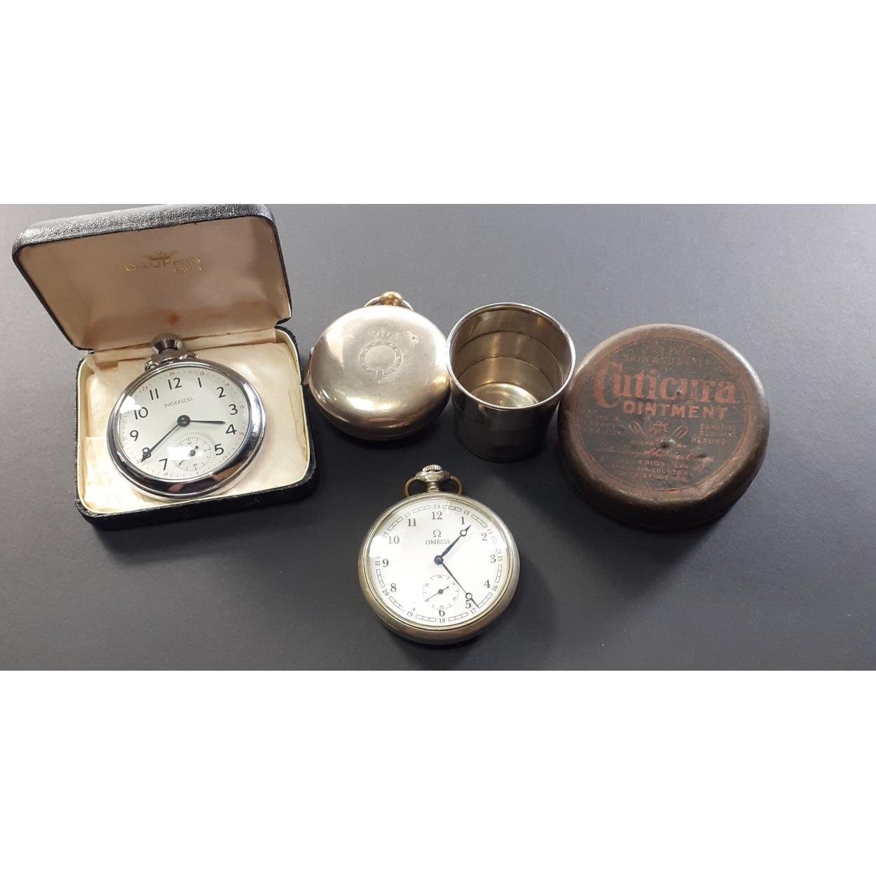 Pocket watches x2. Ingersoll stop watch, not running and one other with a U Boat applied on the back. Also a pair case.