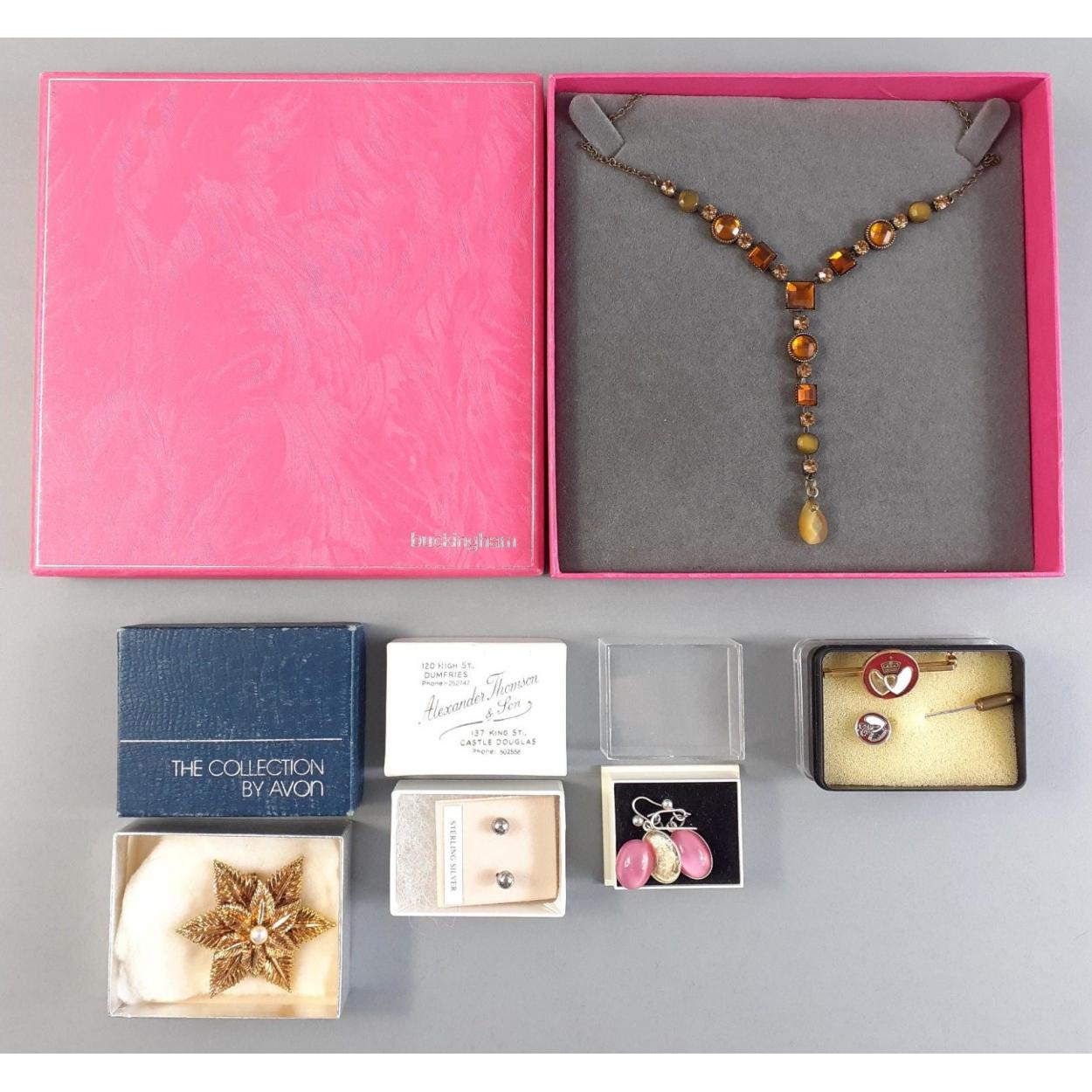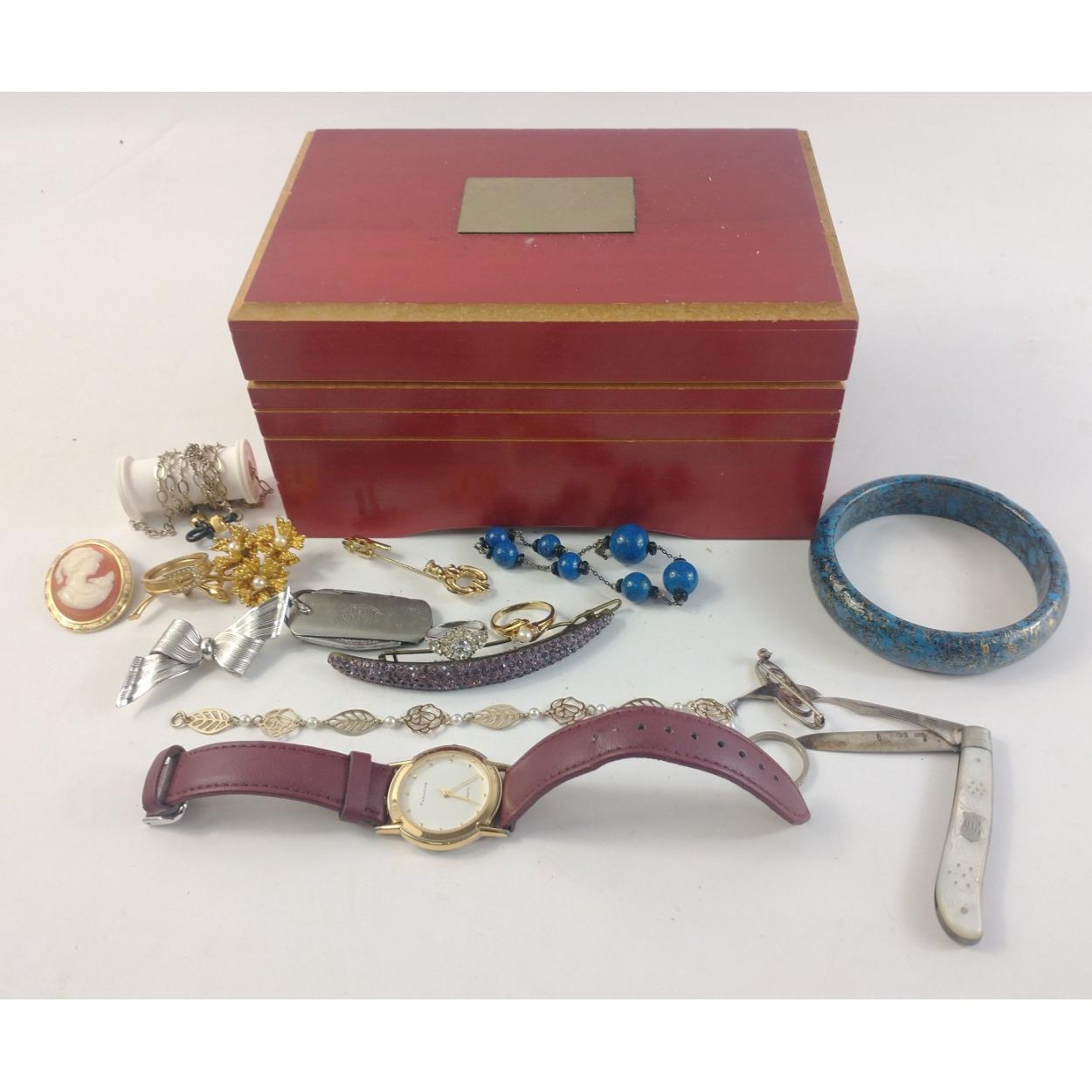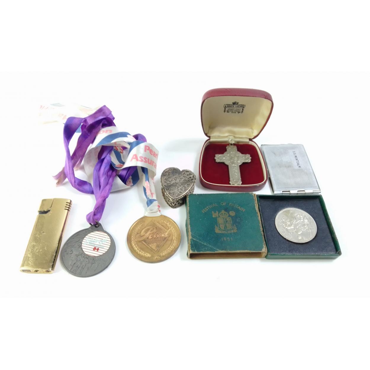 A small mixed lot of interesting items to include gilt Colibri lighter, 1951 boxed Crown, plated heart shaped pillbox, stamp holder, crucifix and marathon medals.