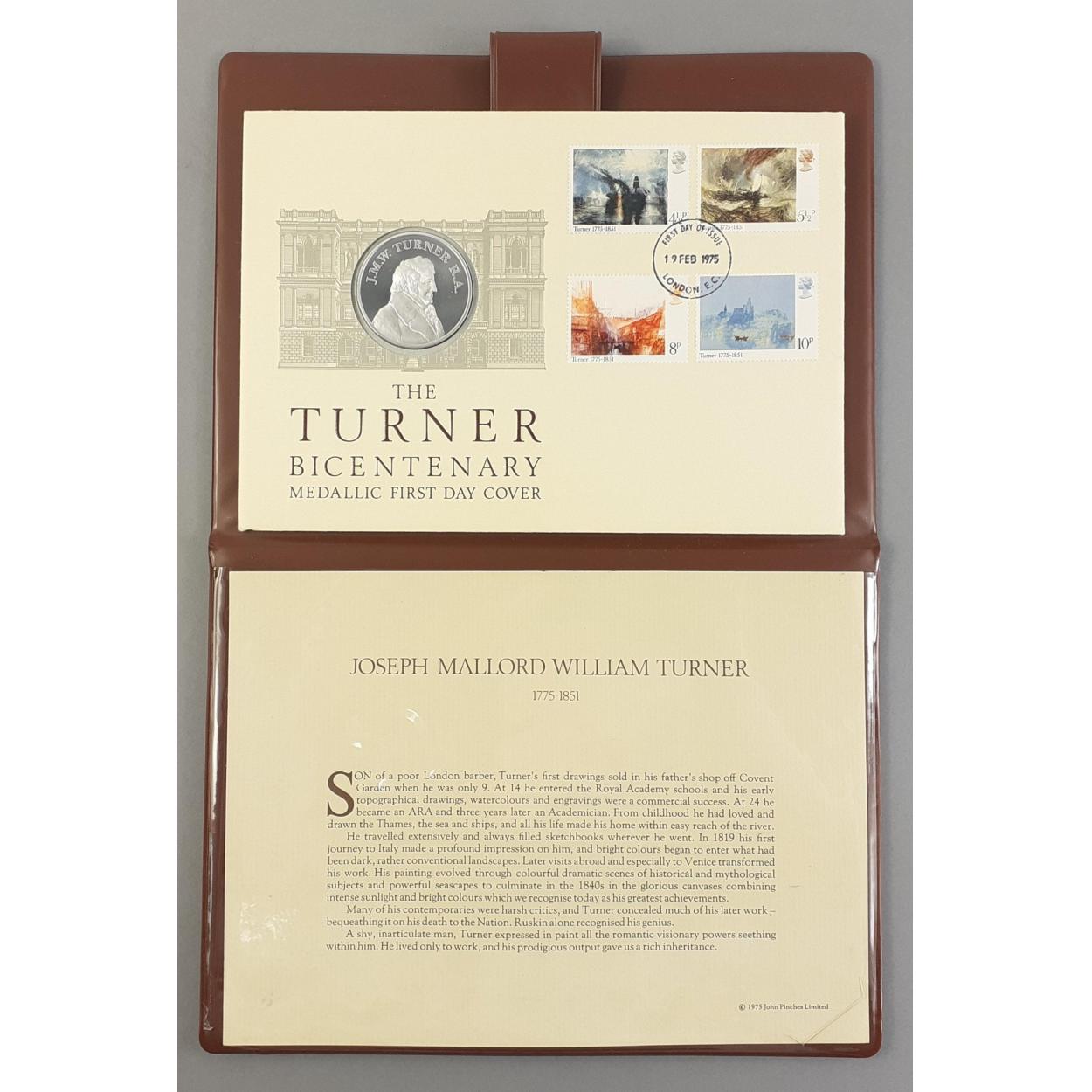 1975 JMW Turner Bicentenary 925 Silver Medallic First Day Cover John Pinches FDC in folder with documents.