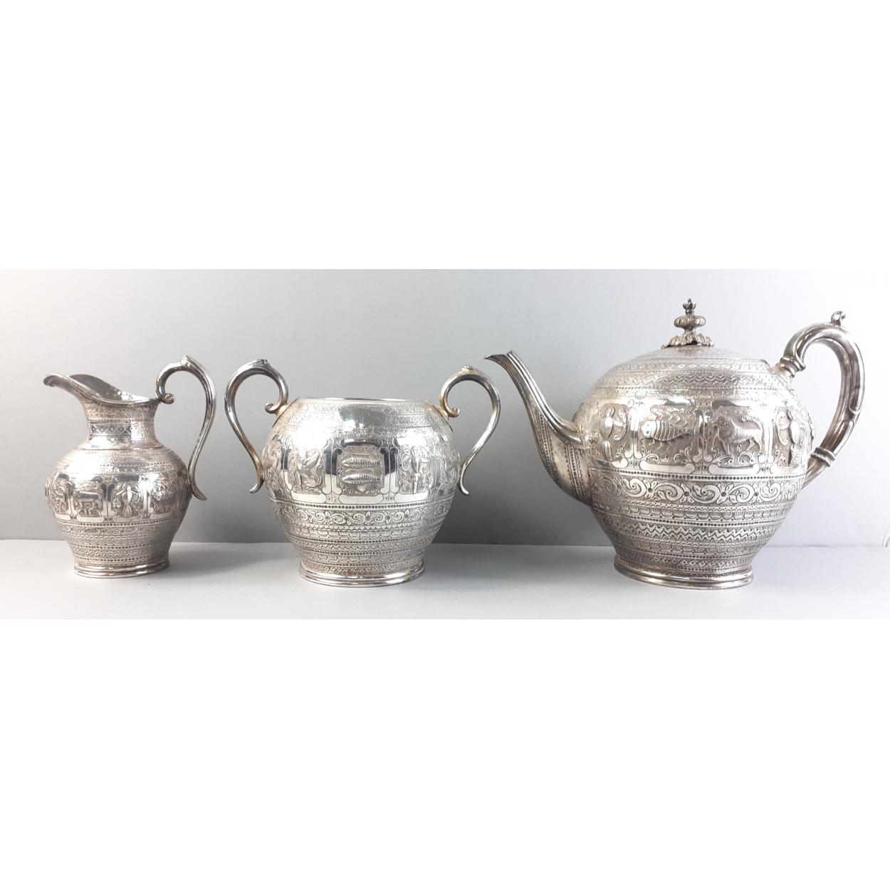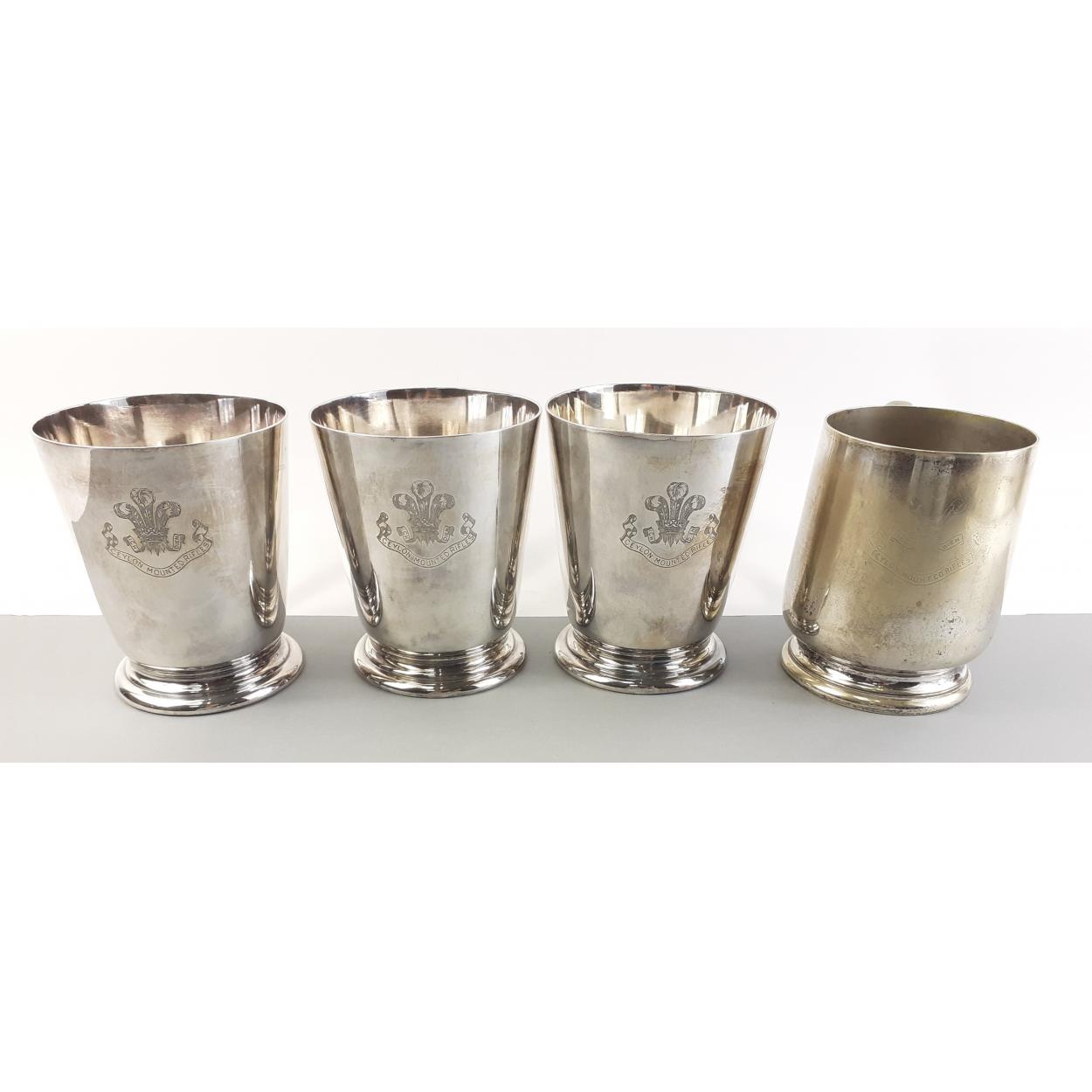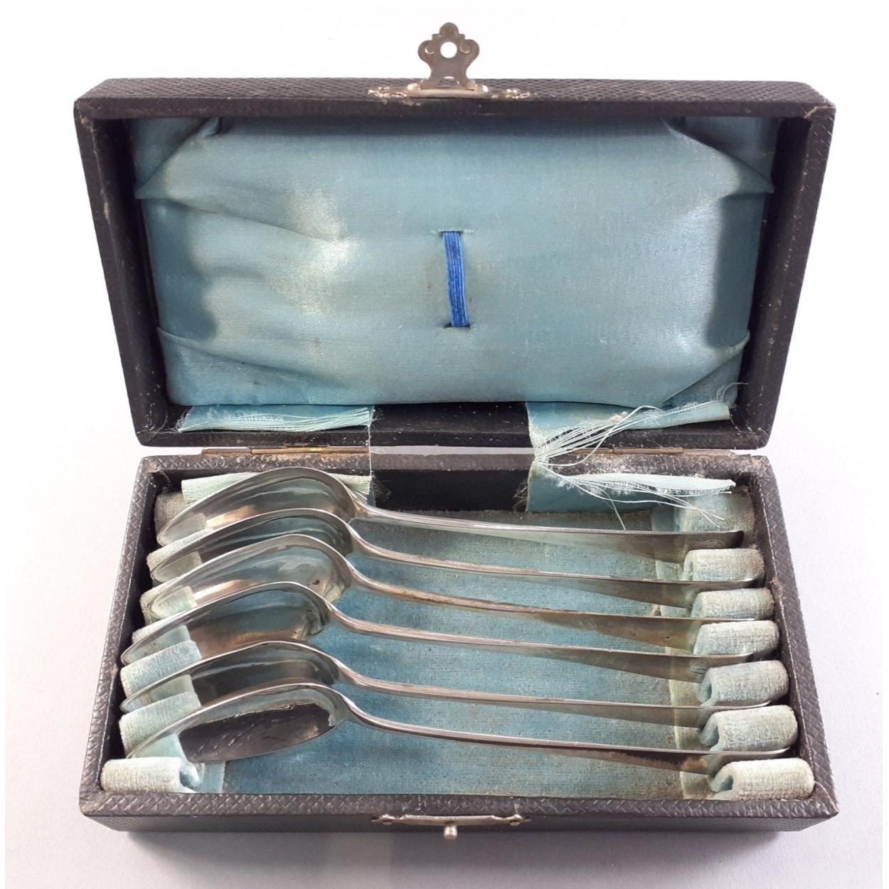 A superb STERLING SILVER mounted coffee can set with matched hallmarks and spoons for Sheffield 1934. Silversmiths Cooper Brothers. Cans and plates by George Jones. One saucer and two cans with historic crack marks but the set presents very well.