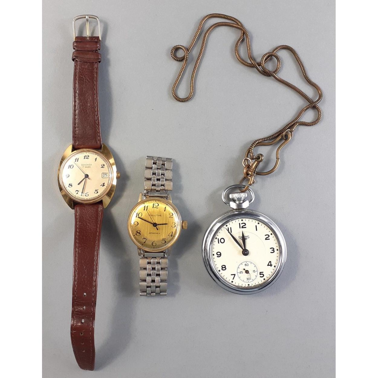 Three vintage timepieces to include Smith's stopwatch (no glass, not running), Sekonda 17 jewels watch runs for a little while and a Phillitime gent's watch not running. All require work.