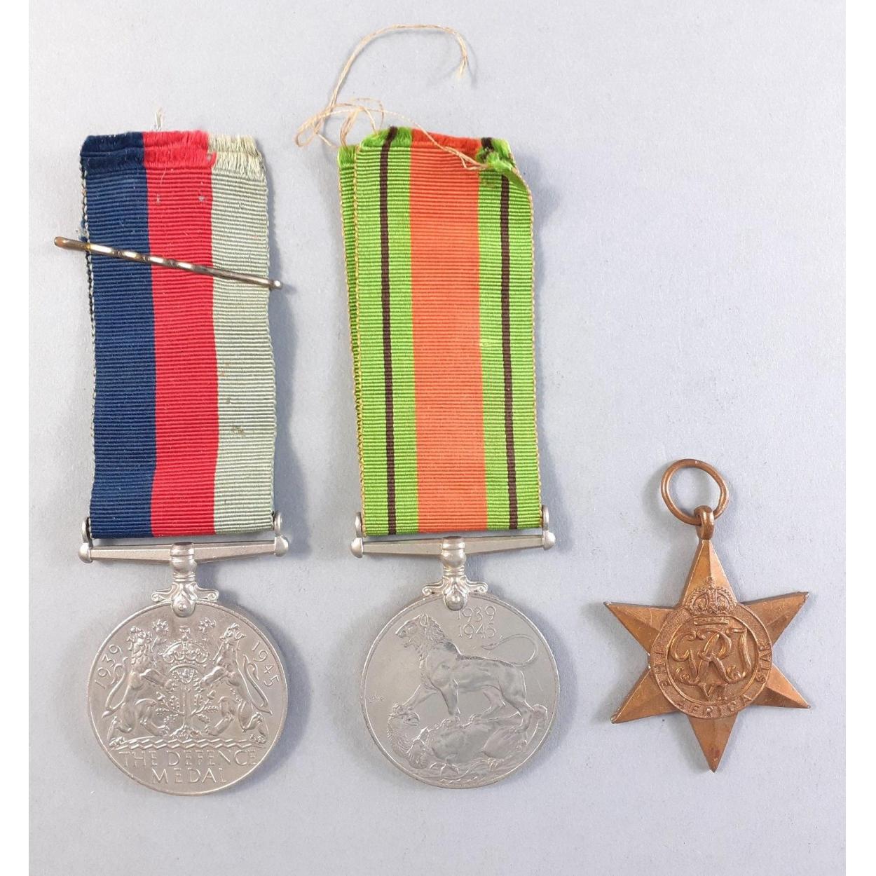 WWII Medal trio comprising Africa Star without ribbon, 39-45 Medal and Defence medal.
