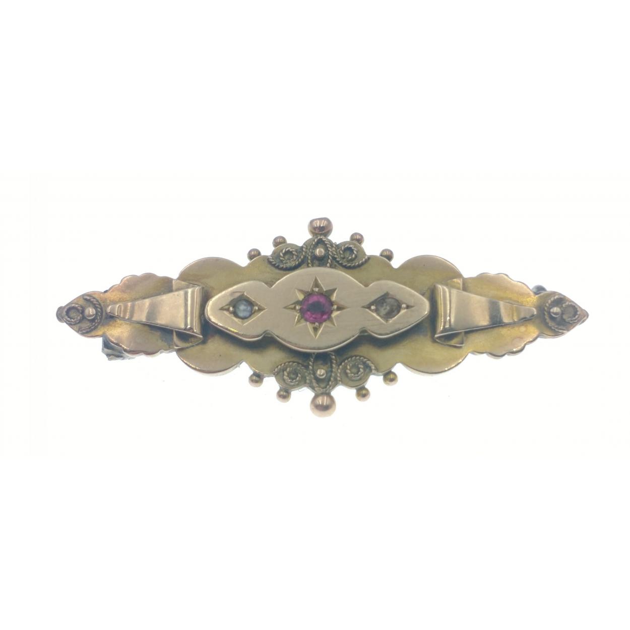 A 9ct marked bar brooch with red centre stone and seed pearls. Note missing one seed pearl. 4cm approx. Gross weight 3g approx
