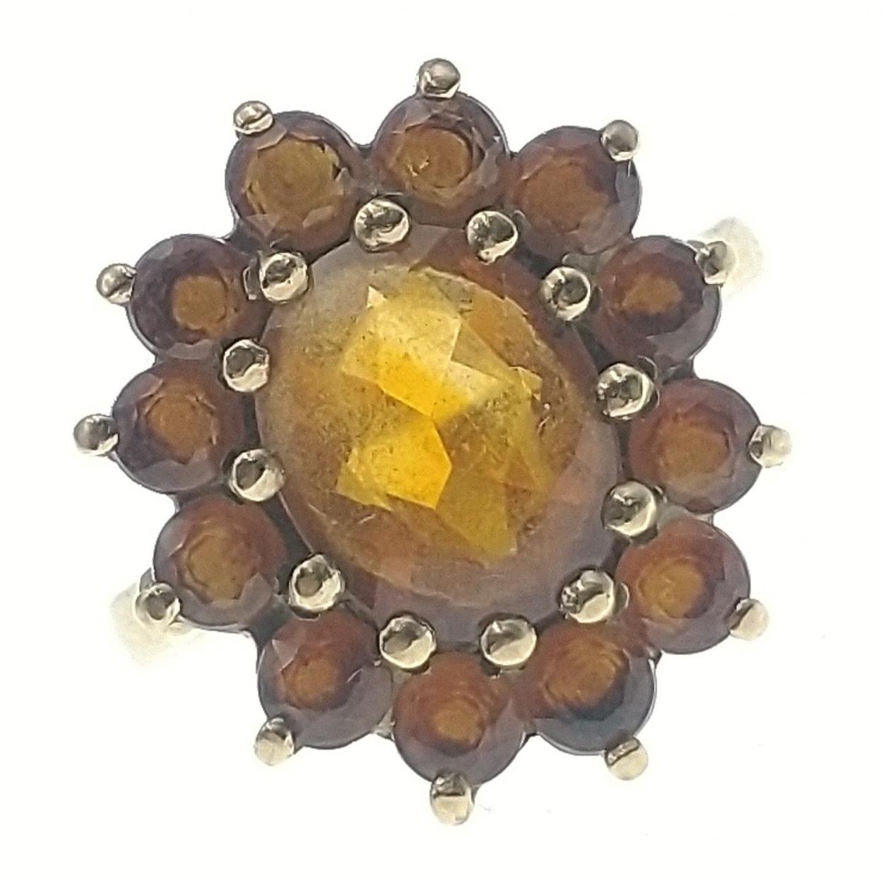 A 375 9ct ring with a cluster of amber coloured stones, a very pretty piece. Size N. Gross weight 4.55g approx