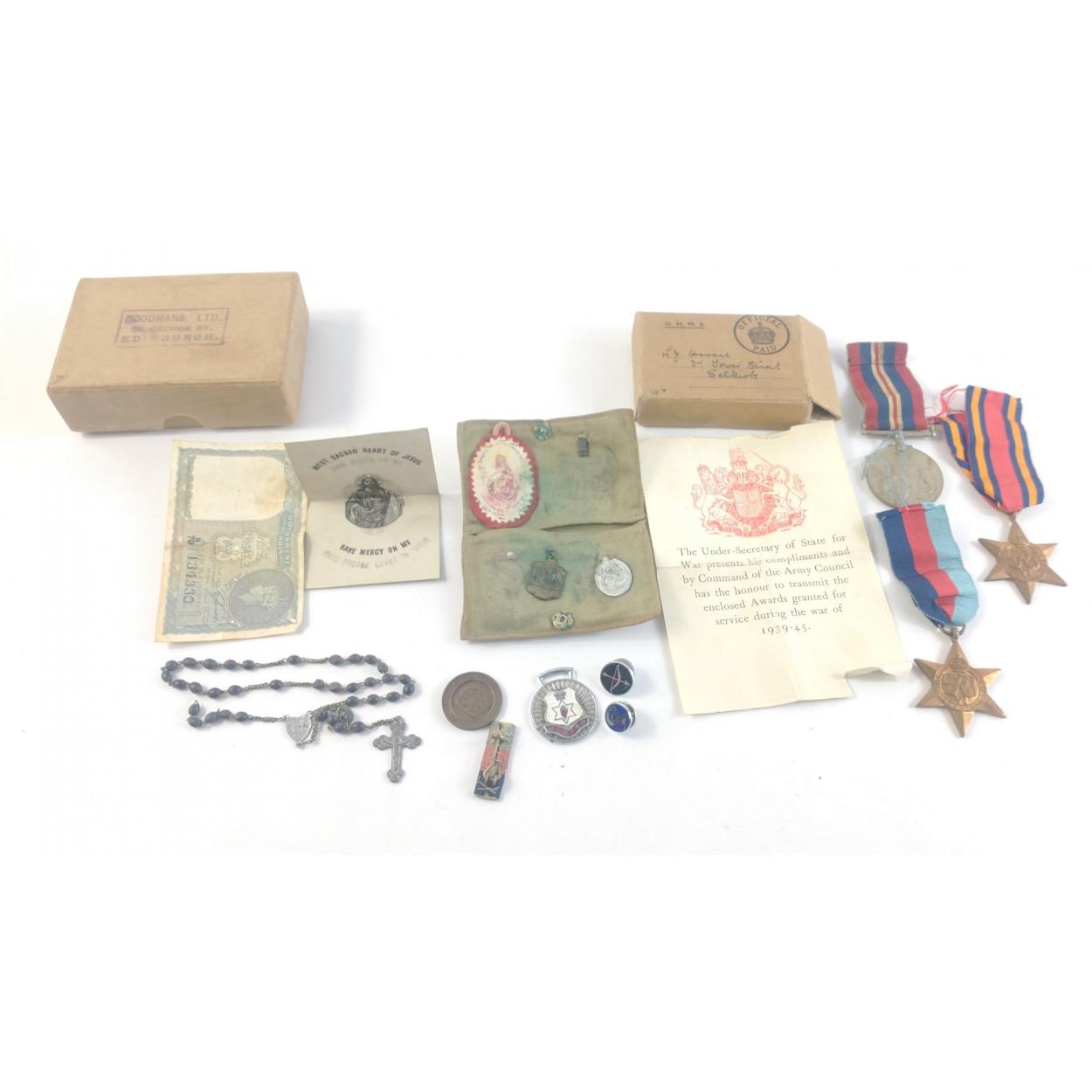A boxed set of WWII medals sent to a Selkirk man. Award slip shows four medal awards including Burma Star. NB Defence medal missing. Also includes Selkirk Masonic Penny and a Catholic soldiers travel wallet. Poignant little group.