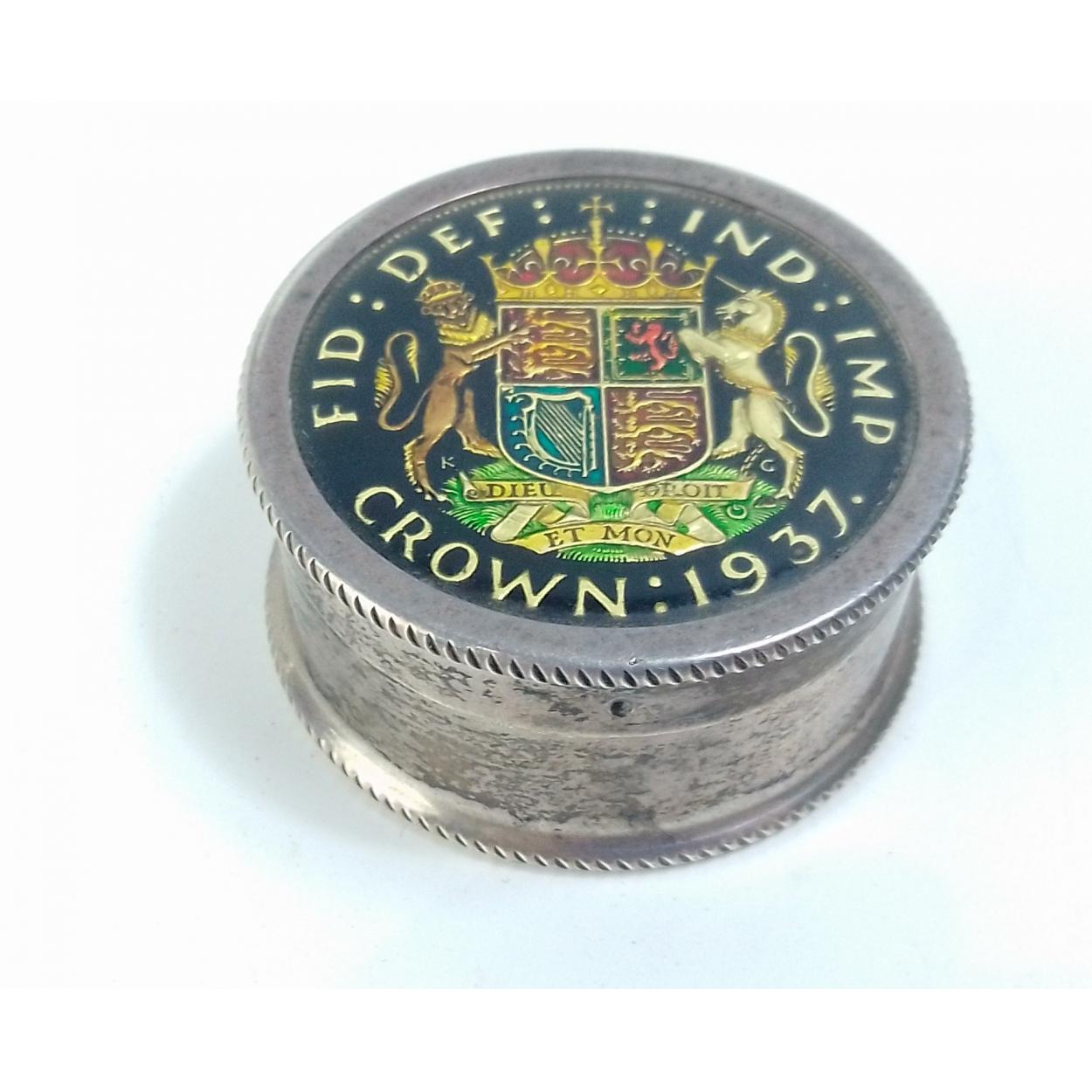 A silver hallmarked pill box topped with a 1937 enamelled crown, 40mm dia approx.