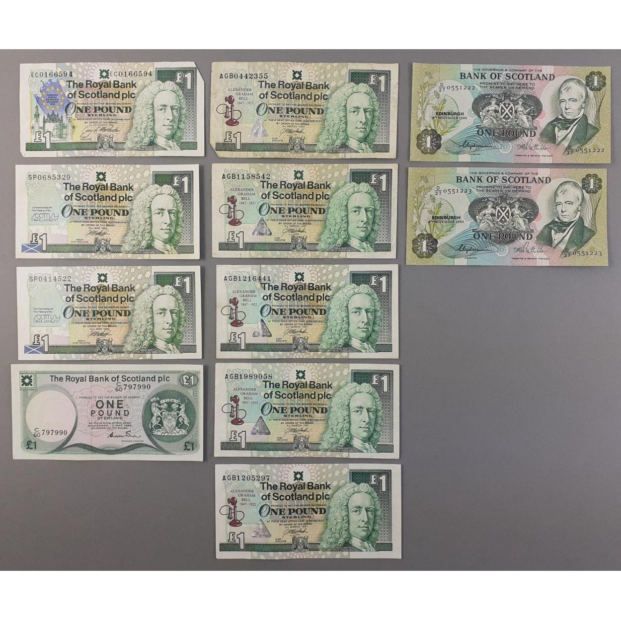Scottish One Pound banknotes in circulated condition. Eleven notes.
