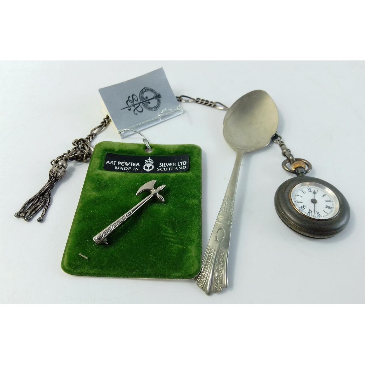 A small (3cm) steel cased fob watch on chain along with a Lauder Axe art pewter brooch and a spoon.