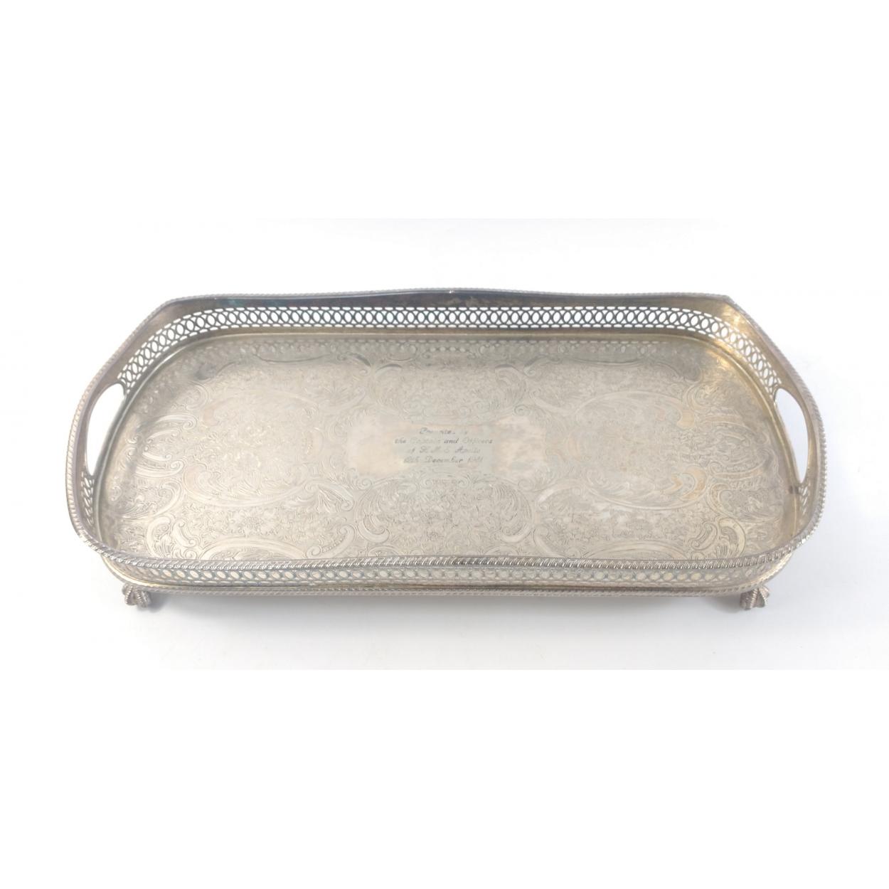 A wonderful heavy gauge silver plate on copper gallery presentation tray on ball and claw feet. Cartouche inscribed with ''Presented by the Captain and Officers of HMS APOLLO 12th December 1981''. 41cm long and in good condition. A lovely naval memento.