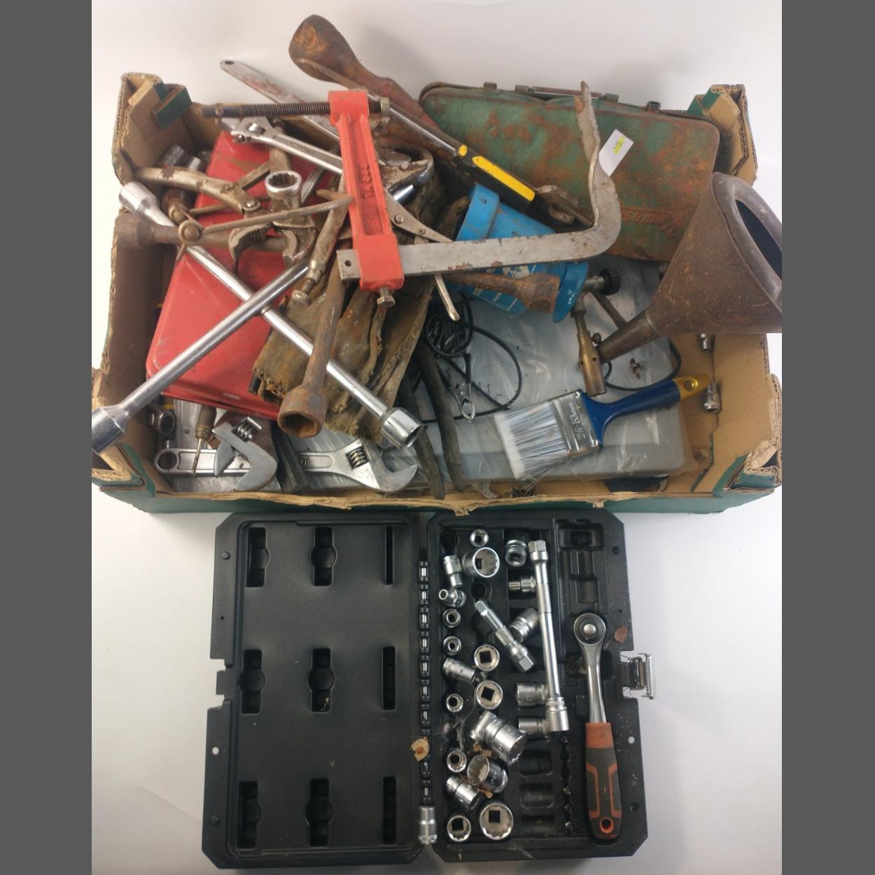 Box of mixed tools including ratchet socket set, blow torch, small solar panel and other tools two wheel spiders, saws etc.